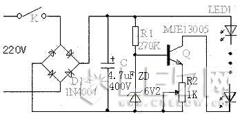 本文先從采用恒流源的電路開始,本電路中的主要元件三極管,要求其耐壓要400V以上,功率也要10W以上的大功率管,如MJE13003、MJE13005等,并且要加上散熱片,濾波電容C容量為4.7uF,耐壓要有400V以上,發(fā)光管電流的大小由R2調(diào)整決定,為方便調(diào)整可用可變電阻調(diào)整后再換上相同阻值的固定電阻,本電路可帶發(fā)光管數(shù)量少則十幾只,最多可達(dá)到90多只,雖然增加了一些成本,但使用效果要比只用電阻限流的電路好得多,即使電壓波動(dòng)較大,電路仍然能保持電流恒定不變,這對(duì)發(fā)光管的壽命是非常有利的,在此范圍內(nèi)的電流都能基本保持恒定不變。本電路使用發(fā)光管數(shù)量也不可太少,越少其效率也越低。本電路總耗電功率約6W。