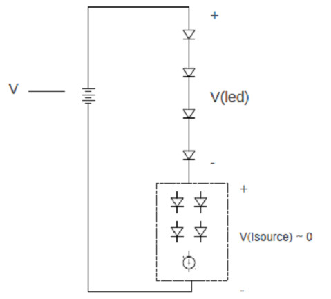 其中方塊中的這部分LED就是可以自適應(yīng)地接入到主串LED中,也可以從主串中自適應(yīng)地斷開。接入或斷開的個數(shù)由輸入電壓變化的大小而決定。它能感知輸入電壓的變化,并由此來決定LED數(shù)目的變化,所以它是自適應(yīng)的,也可以說是智能的。