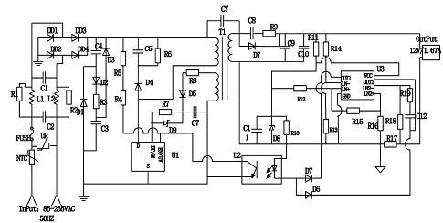 電源的核心部分采用反激式變換器,結(jié)構(gòu)簡(jiǎn)單,易于實(shí)現(xiàn)。整體設(shè)計(jì)電路圖如圖1。