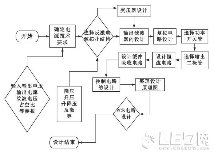 如同開關電源設計一樣,LED凈化燈驅動反激電源也是先進行總體考慮,然后對電源各部分分別進行設計,接下來就是設計總體和輔助功能,最后進行測試和設計優(yōu)化的。下面設計步驟流程:
