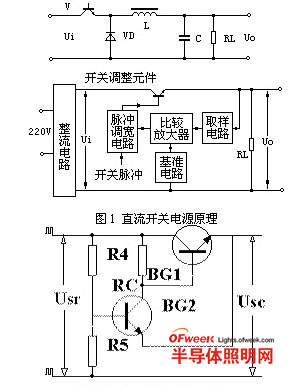 在直流LED凈化燈開關電源電路中,為了保護調整管在電路短路、電流增大時不被燒毀。其基本方法是,當輸出電流超過某一值時,調整管處于反向偏置狀態(tài),從而截止,自動切斷電路電流。如圖1所示,過電流保護電路由三極管BG2 和分壓電阻R4、R5組成。電路正常工作時,通過R4與R5的壓作用,使得BG2 的基極電位比發(fā)射極電位高,發(fā)射結承受反向電壓。于是BG2 處于截止狀態(tài)(相當于開路),對穩(wěn)壓電路沒有影響。當電路短路時,輸出電壓為零,BG2 的發(fā)射極相當于接地,則BG2 處于飽和導通狀態(tài)(相當于短路),從而使調整管BG1 基極和發(fā)射極近于短路,而處于截止狀態(tài),切斷電路電流,從而達到保護目的。