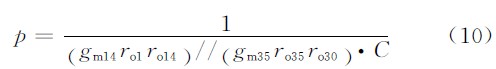 其中,gm為輸入差分對管的跨導(dǎo),//代表電阻并聯(lián),gm14和gm35分別為晶體管MN14和MP35的跨導(dǎo),ro1,ro14,ro35,ro30分別為差分輸入對管和MN14,MP35,MP30的輸出電阻。