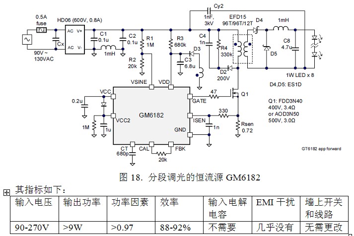 為了利用現(xiàn)有的墻上開關(guān)和墻內(nèi)的兩根線,臺(tái)灣有一家公司推出了一種稱之為EZ-Dimming的GM6182的四段開關(guān)調(diào)光不失為一種好方案。它只利用墻上的普通電燈開關(guān)就能實(shí)現(xiàn)4段調(diào)光,第一次開為全亮,第二次快速開關(guān)為60%亮度,第三次快速開關(guān)為40%亮度,第四次快速開關(guān)為20%亮度。這種系統(tǒng)的優(yōu)點(diǎn)是可以利用普通的墻上開關(guān)實(shí)現(xiàn)調(diào)光。而且其功率因素高達(dá)0.92以上。沒(méi)有產(chǎn)生干擾信號(hào)之慮。缺點(diǎn)是無(wú)法連續(xù)調(diào)光。還有操作麻煩一些。它實(shí)際上可以和恒流源設(shè)計(jì)在一起(圖18)。